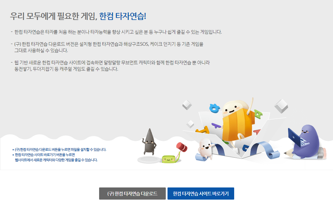 타자연습 찾으시는 분들을 위해 얼른 요약해드리겠습니다. '한컴타자연습 2020'은 과거에는 프로그램을 직접 PC에서 설치해서 이용할 수 있었는데요 무료 버전은 두가지로 나뉩니다. 구버전대로 설치파일을 통해 컴퓨터에서 직접 이용하는 방법이 있고 웹브라우저를 통해 바로 타자연습과 게임을 즐길 수 있는 모드로 나뉘어있습니다.