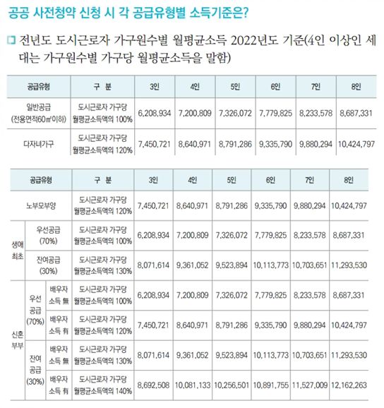 공급별로 기준이 다르고 전년도 도시근로자 가구원수별 월평균소득을 기준으로 합니다.